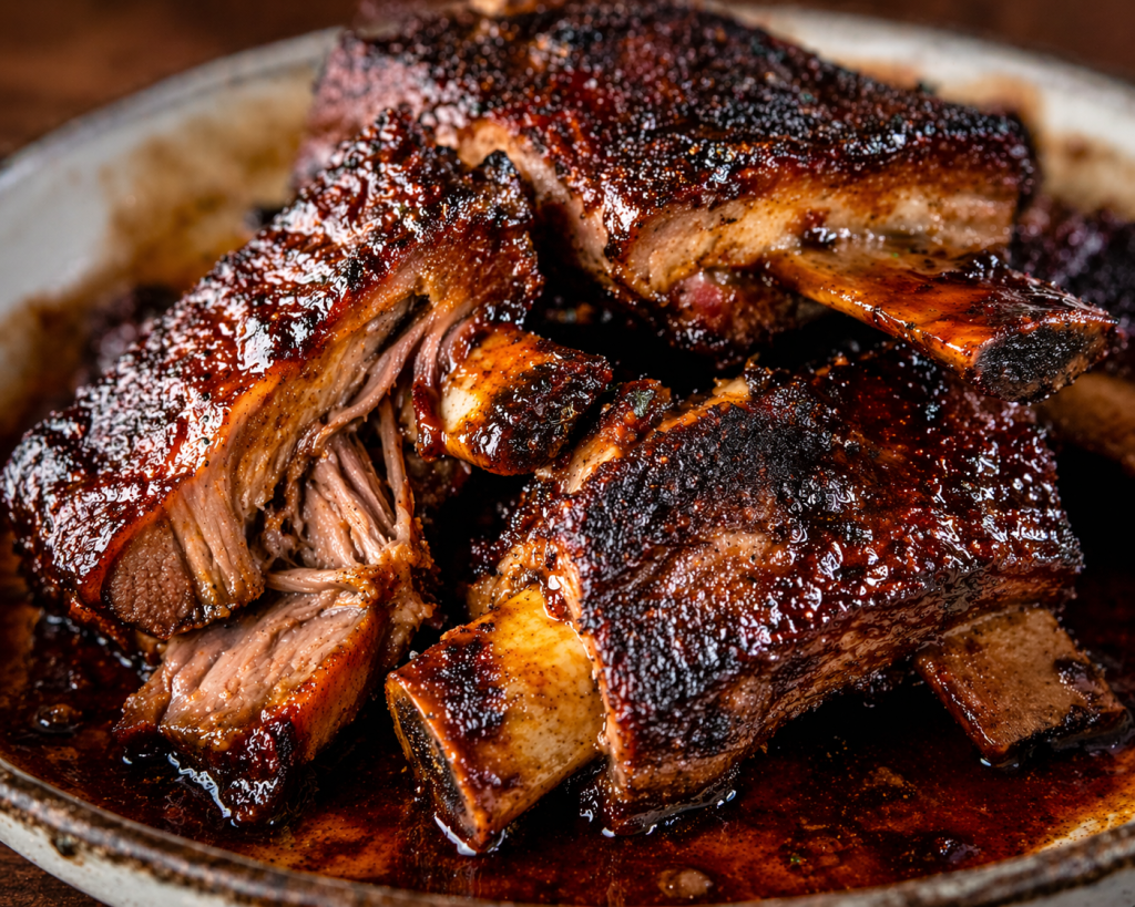 Coat pork short ribs evenly with BBQ rub. - Sear the ribs